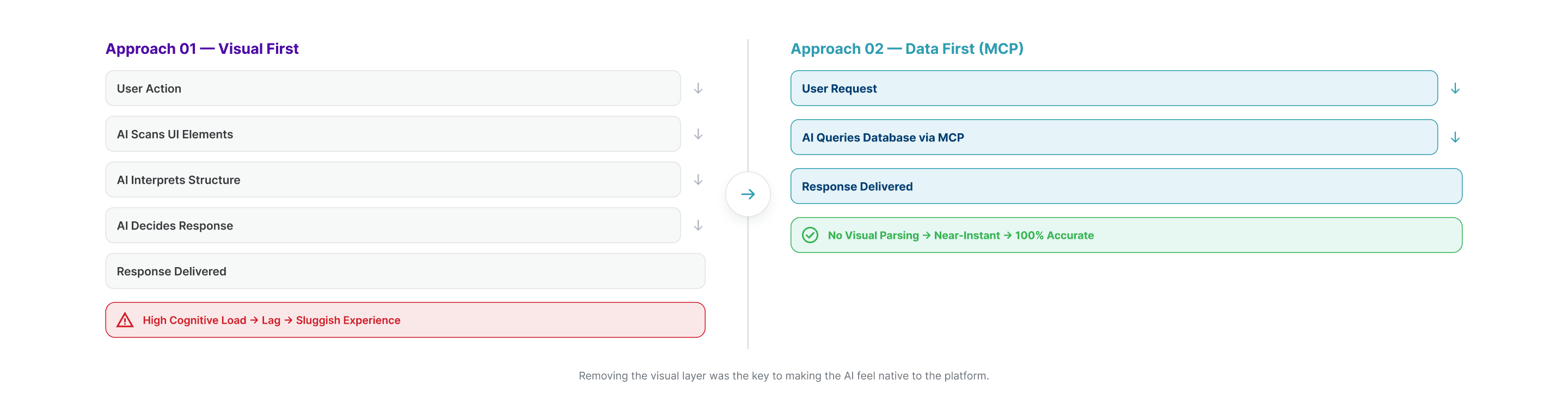 An early approach attempted to give the AI the ability to "see" the interface, identifying UI elements in real time to guide navigation. In practice, the cognitive load on the model was too high, causing noticeable lag and making the experience feel sluggish. The pivot was instead of teaching the AI to observe the UI, the team built a direct connection to the database using the Model Context Protocol (MCP). This removed the visual layer entirely for data tasks, making responses near-instant and 100% accurate to the system's live state.